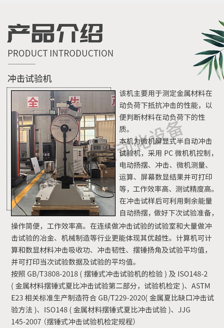 按照 GB/T3808-2018 (擺錘式沖擊試驗機的檢驗)及 ISO148-2(金屬材料擺錘式夏比沖擊試驗第二部分,試驗機檢定)、ASTM E23 相關標準生產制造符合 GB/T229-2020(金屬夏比缺口沖擊試驗方法)、ISO148 (金屬材料擺錘式夏比沖擊試驗)、JJG 145-2007 (擺錘式沖擊試驗機檢定規程)