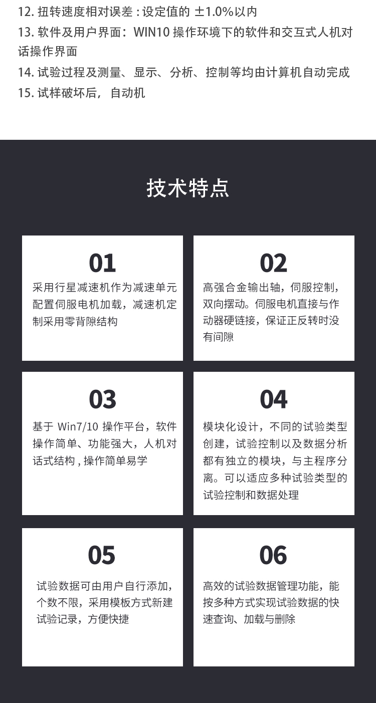 軟件部分: ?基于Win7/10操作平臺,軟件操作簡單、功能強(qiáng)大,人機(jī)對話式結(jié)構(gòu)。操作簡單易學(xué) ?軟件采用模塊化設(shè)計(jì),不同的試驗(yàn)類型創(chuàng)建,試驗(yàn)控制以及數(shù)據(jù)分析都有獨(dú)立的模塊,與主程序分離??梢赃m應(yīng)多種試驗(yàn)類型的試驗(yàn)控制和數(shù)據(jù)處理 ?試驗(yàn)數(shù)據(jù)可由用戶自行添加,個(gè)數(shù)不限,采用模板方式新建試驗(yàn)記錄,方便快捷 ?自動完成試驗(yàn)過程、判斷破型,自動記錄保存試驗(yàn)數(shù)據(jù)。所有試驗(yàn)數(shù)據(jù)以國際通用的XML格式保存 ?高效的試驗(yàn)數(shù)據(jù)管理功能,能按多種方式實(shí)現(xiàn)試驗(yàn)數(shù)據(jù)的快速查詢、加載與刪除 ?試驗(yàn)結(jié)束系統(tǒng)自動分析、統(tǒng)計(jì)試驗(yàn)結(jié)果,分析方式可由用戶自行設(shè)定 ?靈活的報(bào)表編輯功能,為用戶提供了面向圖形排版的專用報(bào)表編輯工具,簡單易學(xué),能方便的打印試驗(yàn)曲線及相關(guān)圖片、文字 ?用戶可根據(jù)需要對試驗(yàn)數(shù)據(jù)進(jìn)行刪除 ?用戶可以根據(jù)需要改變分析方法,數(shù)據(jù)可以根據(jù)本身需要自行修改修約方式 ?專用的數(shù)據(jù)庫管理庫模塊 ?分四檔數(shù)碼顯示試驗(yàn)力值,精度為每檔量程20%開始示值的±1% ?分四檔數(shù)碼顯示變形,精度為每檔量程20%開始±0.5% ?同時(shí)記錄扭矩-時(shí)間,扭角-時(shí)間、扭矩-扭角、扭矩-轉(zhuǎn)角試驗(yàn)曲線,可隨時(shí)切換觀察,任意放大縮小,水平或垂直移動,實(shí)時(shí)高速采樣 ?采用人機(jī)交互方式分析計(jì)算測試材料的機(jī)械性能指標(biāo),試驗(yàn)結(jié)束時(shí)系統(tǒng)會自動計(jì)算最大扭矩、抗扭強(qiáng)度、上下屈服扭矩、規(guī)定非比例扭矩、切變模量等,在自動分析的基礎(chǔ)上,還可以人工干預(yù)修正分析結(jié)果,提高分析的準(zhǔn)確性
