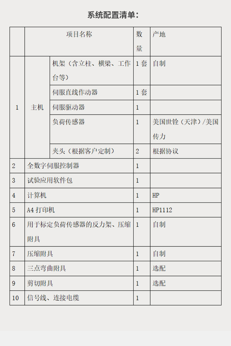 技術指標: 3.1 Z大靜態試驗力:±20kN,全程不分檔,在1-100.%范圍內,示值精度20%起±1%。 3.2 Z大動態試驗力:±20kN,幅值波動度不大于±2%FS,(滿足《JB/T9397-2002 拉壓疲勞試驗機 技術條件》)。 3.3 作動器振幅:±50mm,示值精度20%起±0.5%FS。 3.4 頻率范圍:0.01—15Hz。 3.5幅頻特性:(取決于系統流量) 3.6 Z大速度:250mm/s。 3.7 控制器類型:單通道,位移和力兩路閉環通道。 3.8 主要試驗波形:正弦波、三角波、矩形波、斜波等。 3.9 試驗空間:高度750mm,試驗寬度420mm。 3.10 主機剛度:2.5×108 N/m。 3.11圓試樣夾持范圍:φ5—φ15mm。 3.12 主機重量:650kg 3.13整機功率:5kw 系統配置清單: 項目名稱 數量 產地 1 主機 機架(含立柱、橫梁、工作臺等) 1套 自制 伺服直線作動器 1套 伺服驅動器 1 負荷傳感器 1 美國世銓(天津)/美國傳力 夾頭(根據客戶定制) 2 根據協議 2 全數字伺服控制器 1 3 試驗應用軟件包 1 4 計算機 1 HP 5 A4打印機 1 HP1112 6 用于標定負荷傳感器的反力架、壓縮附具 1 自制 7 壓縮附具 1 自制 8 三點彎曲附具 1 選配 9 剪切附具 1 選配 10 信號線、連接電纜 1