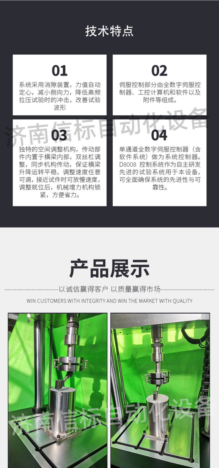 濟南信標自動化設備有限公司主要生產:動靜態萬能疲勞試驗機,接骨板彎曲試驗機,縫合線拉伸疲勞試驗機,髖膝關節磨損試驗機,電子萬能試驗機、液壓萬能試驗機、巖石三軸、四軸,電液拉力試驗機,材料試驗機,高低溫蠕變,高低頻疲勞,拉伸、扭轉、杯突等二十多個系列兩千多個的品種。