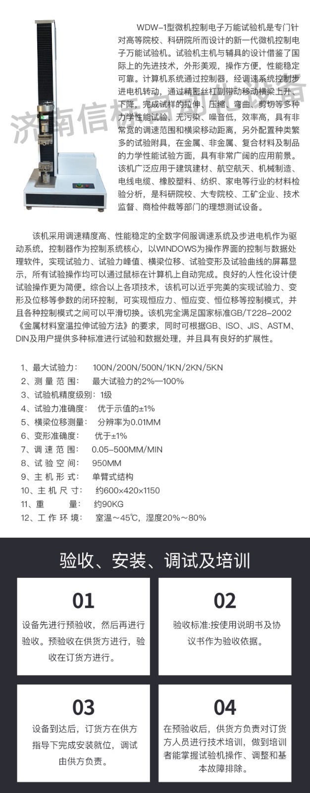 飯盒壓縮抗壓試驗機 單臂壓力萬能試驗機主要技術(shù)指標(biāo): 1、 最大試驗力: 100N/200N/500N/1KN/2KN/5KN 2、 測 量 范 圍: 最大試驗力的2%—100% 3、 試驗機精度級別:1級 4、 試驗力準(zhǔn)確度: 優(yōu)于示值的±1% 5、 橫梁位移測量: 分辨率為0.01mm 6、 變形準(zhǔn)確度: 優(yōu)于±1% 7、 調(diào) 速 范 圍: 0.05-500mm/min 8、 試 驗 空 間: 950mm 9、 主 機 形 式: 單臂式結(jié)構(gòu) 10、 主 機 尺 寸: 約600×420×1150 11、 重 量: 約90Kg 12、 工 作 環(huán) 境: 室溫~45℃,濕度20%~80% 飯盒壓縮抗壓試驗機 單臂壓力萬能試驗機主要功能及特點: 主機: 1.1調(diào)速系統(tǒng)采用伺服電機和自主研發(fā)減速系統(tǒng),性能穩(wěn)定可靠,具有過流、過壓、過載等保護裝置。調(diào)速范圍可達0.05~500mm/min。 1.2傳動部分采用圓弧同步齒形帶,精密絲杠副傳動,傳動平穩(wěn),噪音低,傳動效率高。 1.3萬向節(jié)采用十字插銷結(jié)構(gòu),而且具有擺角限制功能,一方面便于試樣夾持,保證試驗同心度,另一方面很好的消除了不規(guī)則試樣對傳感器的影響。 2、控制系統(tǒng)、操作軟件及數(shù)據(jù)處理系統(tǒng) 2.1計算機控制系統(tǒng),具有集成度高、性能穩(wěn)定、調(diào)整方便等優(yōu)點??梢詫嶒灁?shù)據(jù)進行實時采集,對實驗特性曲線實現(xiàn)實時動態(tài)顯示,試驗數(shù)據(jù)文件能以Access常用數(shù)據(jù)庫或SQLserve大型數(shù)據(jù)庫的方式保存,方便實現(xiàn)客戶的資源共享及網(wǎng)絡(luò)管理,以及用戶的再分析。對于用戶自定義的各種word2000報表,該軟件可輕松實現(xiàn)訪問,解決了不同用戶或同一用戶在不同時期對試驗報表有不同需要的難題。該軟件可處理試驗力、位移、 時間、變形的原始數(shù)據(jù)及由此派生的曲線。
