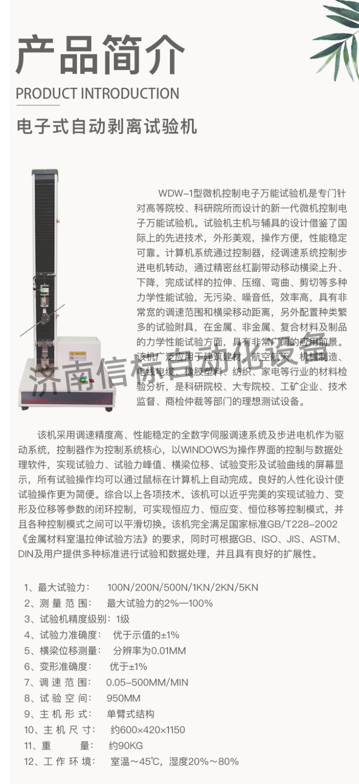高強(qiáng)度膠黏劑膠帶浮棍法90度180度剝離強(qiáng)度試驗(yàn)機(jī)主要技術(shù)指標(biāo): 1、最大試驗(yàn)力: 100N/200N/500N/1KN/2KN/5KN 2、測(cè) 量 范 圍: 最大試驗(yàn)力的2%—100% 3、試驗(yàn)機(jī)精度級(jí)別:1級(jí) 4、試驗(yàn)力準(zhǔn)確度: 優(yōu)于示值的±1% 5、橫梁位移測(cè)量: 分辨率為0.01mm 6、變形準(zhǔn)確度: 優(yōu)于±1% 7、調(diào) 速 范 圍: 0.05-500mm/min 8、試 驗(yàn) 空 間: 950mm 9、主 機(jī) 形 式: 單臂式結(jié)構(gòu) 10、主 機(jī) 尺 寸: 約600×420×1150 11、重 量: 約90Kg 12、工 作 環(huán) 境: 室溫~45℃,濕度20%~80%