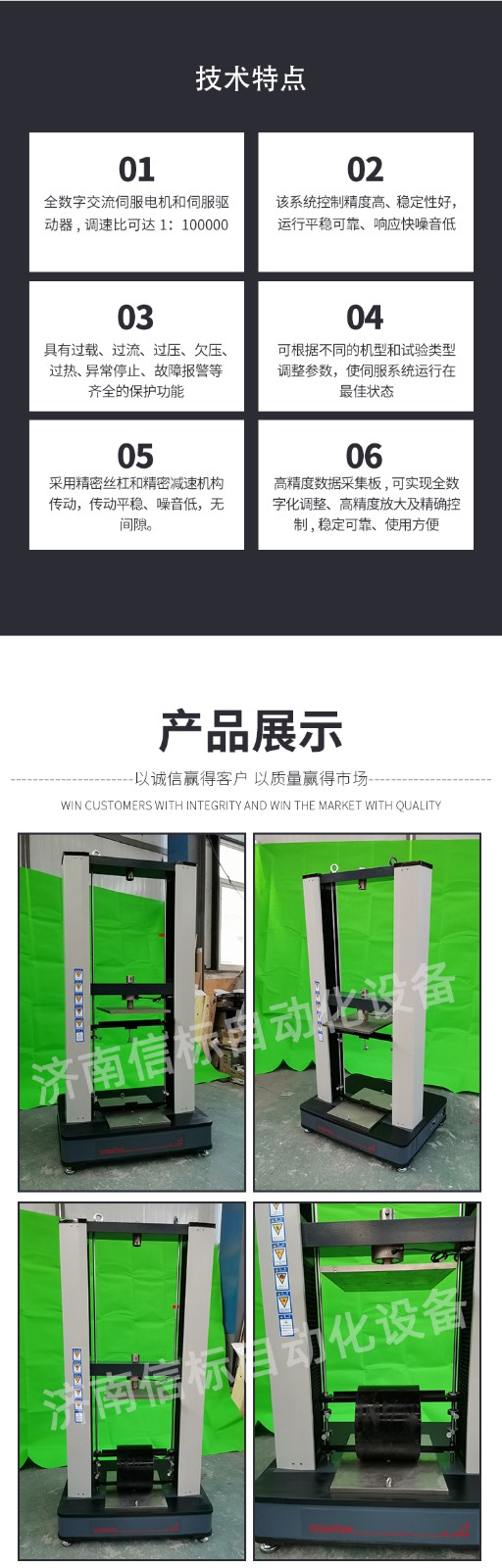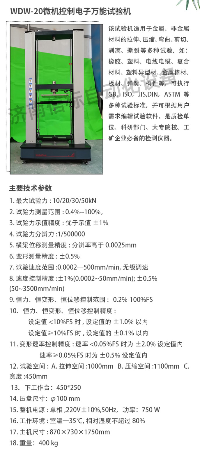 測量參數(shù): 1. 最大試驗力: 10/20/30/50kN 2. 試驗力測量范圍: 0.4%--100%。 3. 試驗力示值精度:優(yōu)于示值±1% 4. 試驗力分辨力:1/500000 5. 橫梁位移測量精度:分辨率高于0.0025mm 6. 變形測量精度: ±0.5% 7. 試驗速度范圍:0.0002—500mm/min,無級調(diào)速 8. 速度控制精度:±1%(0.0002~50mm/min); ±0.5%(50~3500mm/min) 9. 恒力、恒變形、恒位移控制范圍: 0.2%-100%FS 10.恒力、恒變形、恒位移控制精度: 設(shè)定值<10%FS時,設(shè)定值的±1.0%以內(nèi) 設(shè)定值≥10%FS時,設(shè)定值的±0.1%以內(nèi) 11. 變形速率控制精度: 速率<0.05%FS時為±2.0%設(shè)定值內(nèi) 速率≥0.05%FS時為±0.5%設(shè)定值內(nèi) 12. 試驗空間: A.拉伸空間:1000mm B.壓縮空間:1100mm C.寬度:450mm 13.下工作臺:450*250 14. 壓盤尺寸:φ100 mm 15. 整機(jī)電源:單相,220V±10%,50Hz,功率:750 W 16. 工作環(huán)境:室溫—35℃,相對濕度不超過80% 17. 主機(jī)尺寸: 870×730×1750mm 18. 重量:400 kg 產(chǎn)品配置: 1、主機(jī) 一套 2、松下A7全數(shù)字伺服電機(jī)及伺服驅(qū)動器; 一套 3、高精度負(fù)荷傳感器; 5kn/1kn/500N/200/ 各一支 4、Hiwin精密滾珠絲杠; 2支 5、光電編碼器(2500線,內(nèi)置); 1支 6、夾具:滿足海綿/汽車座椅所需工裝 1套(有多種) 7、三閉環(huán)測量系統(tǒng)一套,采用力,位移,應(yīng)變等多種控制方式,試驗過程中可實時顯示力-位移,力-時間,應(yīng)力-應(yīng)變等多種試驗曲線,并可自動得出最大負(fù)荷,拉伸強(qiáng)度,斷裂伸長率等多種 結(jié)果參數(shù)。 8、HP品牌計算機(jī),21寸液晶顯示器; 9、打印機(jī):HPA4彩色噴墨打印機(jī); 10、專用試驗軟件:可執(zhí)行GB,ISO,JIS、DIN,ASTM等多種試驗標(biāo)準(zhǔn),全開放式,功能強(qiáng)大,方便操作,免費(fèi)提供升級軟件,并可根據(jù)用戶需求自行編輯試驗軟件。