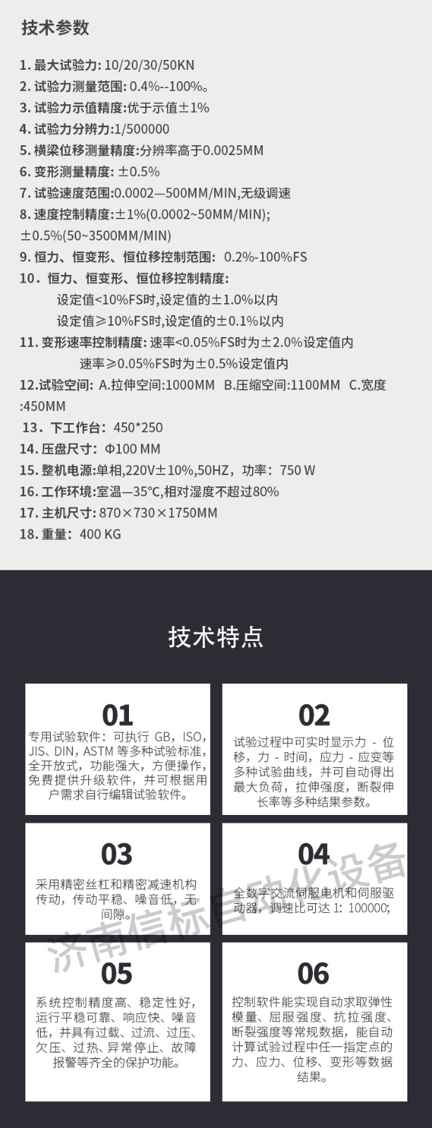 該試驗(yàn)機(jī)適用于金屬、非金屬材料的拉伸、壓縮、彎曲、剪切、剝離、撕裂等多種試驗(yàn),如:橡膠、塑料、電線電纜、復(fù)合材料、塑料異型材、金屬棒材、板材、彈簧、構(gòu)件等??蓤?zhí)行GB,ISO,JIS,DIN,ASTM等多種試驗(yàn)標(biāo)準(zhǔn),并可根據(jù)用戶需求編輯試驗(yàn)軟件。是質(zhì)檢單位、科研部門、大專院校、工礦企業(yè)必備的檢測(cè)儀器。 二、測(cè)量參數(shù): 1. 最大試驗(yàn)力: 10/20/30/50kN 2. 試驗(yàn)力測(cè)量范圍: 0.4%--100%。 3. 試驗(yàn)力示值精度:優(yōu)于示值±1% 4. 試驗(yàn)力分辨力:1/500000 5. 橫梁位移測(cè)量精度:分辨率高于0.0025mm 6. 變形測(cè)量精度: ±0.5% 7. 試驗(yàn)速度范圍:0.0002—500mm/min,無級(jí)調(diào)速 8. 速度控制精度:±1%(0.0002~50mm/min); ±0.5%(50~3500mm/min) 9. 恒力、恒變形、恒位移控制范圍: 0.2%-100%FS 10.恒力、恒變形、恒位移控制精度: 設(shè)定值<10%FS時(shí),設(shè)定值的±1.0%以內(nèi) 設(shè)定值≥10%FS時(shí),設(shè)定值的±0.1%以內(nèi) 11. 變形速率控制精度: 速率<0.05%FS時(shí)為±2.0%設(shè)定值內(nèi) 速率≥0.05%FS時(shí)為±0.5%設(shè)定值內(nèi) 12.試驗(yàn)空間: A.拉伸空間:1000mm B.壓縮空間:1100mm C.寬度:450mm 13.下工作臺(tái):450*250 14. 壓盤尺寸:φ100 mm 15. 整機(jī)電源:單相,220V±10%,50Hz,功率:750 W 16. 工作環(huán)境:室溫—35℃,相對(duì)濕度不超過80% 17. 主機(jī)尺寸: 870×730×1750mm 18. 重量:400 kg 三、產(chǎn)品配置: 1、主機(jī) 一套 2、松下A7全數(shù)字伺服電機(jī)及伺服驅(qū)動(dòng)器; 一套 3、高精度負(fù)荷傳感器; 5kn/1kn/500N/200/ 各一支 4、Hiwin精密滾珠絲杠; 2支 5、光電編碼器(2500線,內(nèi)置); 1支 6、夾具:滿足海綿/汽車座椅所需工裝 1套(有多種)