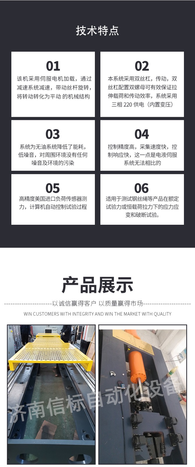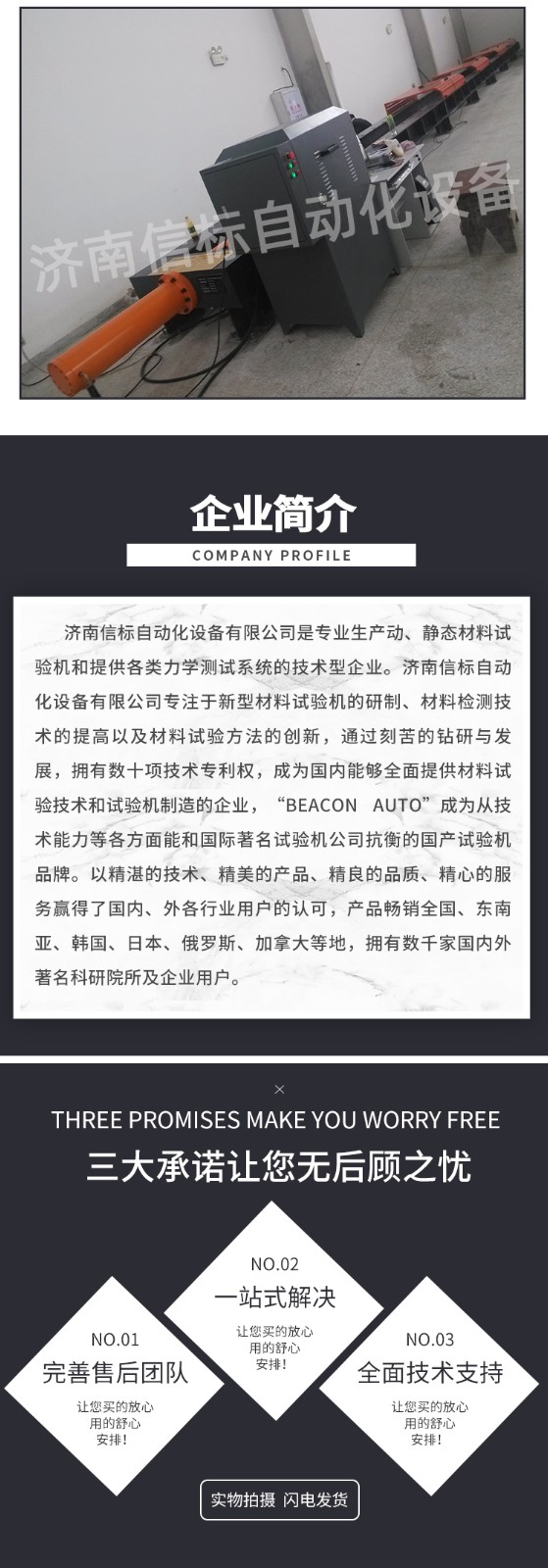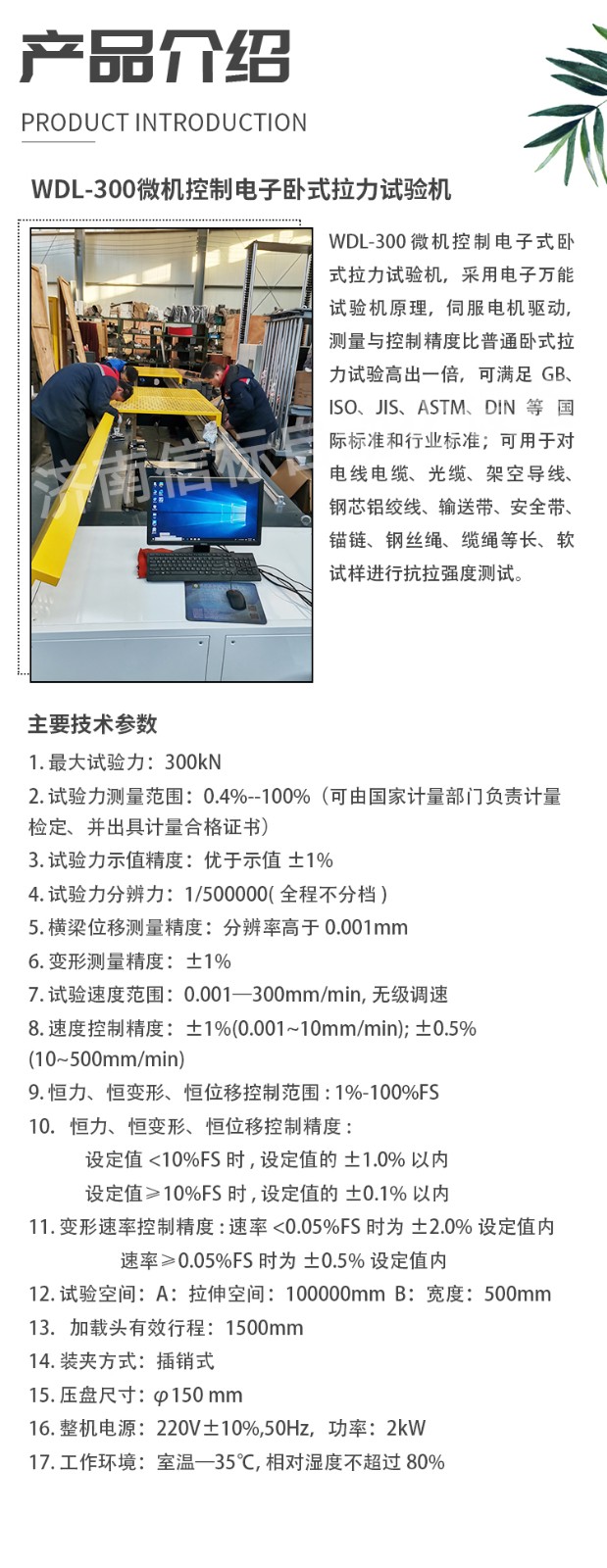 試驗(yàn)標(biāo)準(zhǔn): GB/T 8358-2014 鋼絲繩實(shí)際破斷拉力測(cè)定方法 GB∕T 1179-2008 圓線同心絞架空導(dǎo)線 DL/T 832-2003 光纖復(fù)合架空地線 DL/T 788-2001 全介質(zhì)自承式光纜 GB/T 7424.4-2003 光纜 第4部分:分規(guī)范 光纖復(fù)合架空地線 IEC 60794.4-2009 光纜 第4部分:分規(guī)范 輸電線架空光纜 IEEE 1138-2009 電力事業(yè)用電線的復(fù)合光纖架空地線的建造標(biāo)準(zhǔn) GB/T16491-2008 電子式萬能試驗(yàn)機(jī) GB/T228.1-2010 金屬材料室溫拉伸試驗(yàn) GB/T4909.3-2009 裸電線試驗(yàn)方法 第3部分:拉力試驗(yàn) GB/T14049-2008 額定電壓10KV架空絕緣電纜 GB/T12527-2008 額定電壓1KV及以下架空絕緣電纜 GB/T3955-2009 電工圓鋁線 GB/T17048-2009 架空絞線用鋁線 GB/T17939-2009 電工用鋁包鋼線 GB/T3428/2012 架空絞線用鍍鋅鋼線 三、主要技術(shù)指標(biāo): 1. 最大試驗(yàn)力:300kN 2. 試驗(yàn)力測(cè)量范圍:0.4%--100% (可由國(guó)家計(jì)量部門負(fù)責(zé)計(jì)量檢定、并出具計(jì)量合格證書) 3. 試驗(yàn)力示值精度:優(yōu)于示值±1% 4. 試驗(yàn)力分辨力:1/500000(全程不分檔) 5. 橫梁位移測(cè)量精度:分辨率高于0.001mm 6. 變形測(cè)量精度:±1% 7. 試驗(yàn)速度范圍:0.001—300mm/min,無級(jí)調(diào)速 8. 速度控制精度:±1%(0.001~10mm/min); ±0.5%(10~500mm/min) 9. 恒力、恒變形、恒位移控制范圍: 1%-100%FS 10.恒力、恒變形、恒位移控制精度: 設(shè)定值<10%FS時(shí),設(shè)定值的±1.0%以內(nèi) 設(shè)定值≥10%FS時(shí),設(shè)定值的±0.1%以內(nèi) 11. 變形速率控制精度: 速率<0.05%FS時(shí)為±2.0%設(shè)定值內(nèi) 速率≥0.05%FS時(shí)為±0.5%設(shè)定值內(nèi) 12. 試驗(yàn)空間: A:拉伸空間:100000mm B:寬度:500mm 13.加載頭有效行程:1500mm 14. 裝夾方式:插銷式 15. 壓盤尺寸:φ150 mm 16. 整機(jī)電源:220V±10%,50Hz,功率:2kW 17. 工作環(huán)境:室溫—35℃,相對(duì)濕度不超過80%